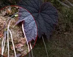 由漆斑菌引起的秋海棠叶斑病症状: 昌感秋海棠 Begonia cavaleriei 病症一般出现在秋海棠叶片边缘、叶尖和破损叶片的叶脉上。坏死区域呈现黑褐色,然后是水渍状。诊断方法是下部的叶片经常会不规则形状的孢子群,中央呈黑色,但边缘为白色。