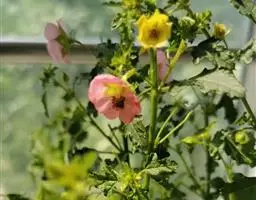 红萼苘麻是锦葵科、苘麻属常绿软木质灌木,叶绿色,长5-10厘米,心形,叶端尖,叶缘有钝锯齿,有时分裂,…