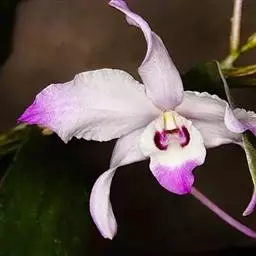 海南钻喙兰(学名:Rhynchostylis gigantea (Lindl. ) Ridl.):根肥厚,粗达10毫米。茎直立,粗壮,具数节,不分枝,具多数二列的叶,被宿存的叶鞘所包。叶肉质,彼此紧靠,宽带状,外弯。花序腋生,下垂,2-4个,通常比叶短;花白色带紫红色斑点,质地较厚,开展;萼片近相似,椭圆状长圆形;花瓣长圆形,比萼片小,先端钝,基部收狭,具5条主脉;唇瓣肉质,深紫红色,贴生在蕊柱足上,向外伸展,近倒卵形,长约17毫米,宽12毫米,基部具一对脊突,上部3裂。蒴果倒卵形,具数个棱。花期1-4月,果期2-6月。