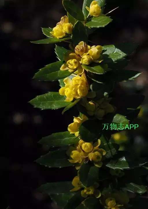 常绿灌木,高1-2米。老枝圆柱形,暗灰色,幼枝淡黄色,具棱槽及疣点;茎刺三分叉,无槽,长1.5-2厘米,与枝同色。叶革质,椭圆形、卵状长圆形、长圆状披针形至倒卵状长圆形或倒披针形,长2.5-4.5厘米,宽1-1.5厘米,先端急尖,具1刺尖头,基部楔形,上面暗绿色,中脉明显凹陷,侧脉清晰可见,背面淡绿色,中脉明显隆起,侧脉不显,两面网脉显著,不被白粉;叶缘通常平展,每边具3-8刺齿,有时具1-2刺锯齿;近无柄。花7-15朵簇生;花梗长5-12毫米;花黄色;小苞片披针形,先端渐尖,长约2.5毫米,宽约1毫米;萼片2轮,外萼片披针形或卵形,先端渐尖,长约3.5毫米,宽约2毫米,内萼片披针形或长圆状椭圆形,先端渐尖或纯,长8-9毫米,宽约3.5毫米;花瓣长圆形或长圆状倒卵形,长约4-5毫米,宽约3.2毫米,先端全缘或浅锐裂,基部楔形,具2枚分离腺体;雄蕊药隔先端微延伸,截形;胚珠2-3枚,具短柄。浆果卵状,长约9毫米,直径约5毫米,顶端具短宿存花柱,微被白粉。花期3-5月,果期8-10月。