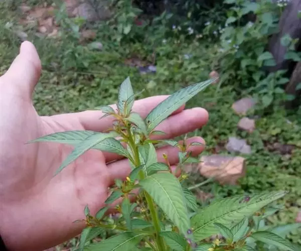 丁香蓼,别名:小石榴树、小石榴叶、小疗药,拉丁文名:Ludwigia prostrata Roxb.,是桃金娘目、柳叶菜科、丁香蓼属一年生直立草本;茎高25-60厘米,粗2.5-4.5毫米,下部圆柱状,上部四棱形,常淡红色,近无毛,多分枝,小枝近水平开展。叶狭椭圆形,先端锐尖或稍钝,基部狭楔形,在下部骤变窄,开花时以四合花粉直接授在柱头上;柱头近卵状或球状,顶端稍偏斜,具小尖头,表面有横条排成的棕褐色纵横条纹;种脊线形,花期6-7月,果期8-9月。