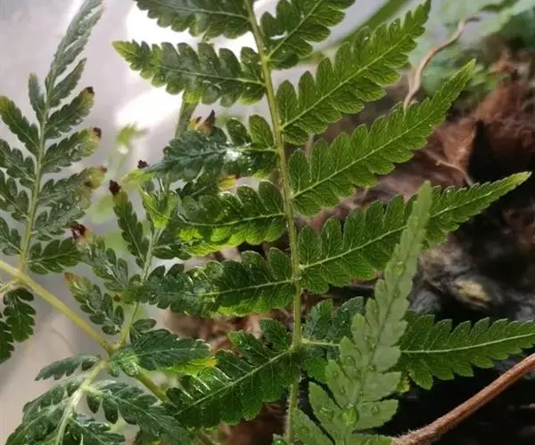植株高35-50(-60)厘米。根状茎长而横走,粗约2毫米,光滑,先端略被披针形鳞片。叶近生;叶柄长15-20(-30)厘米,粗约1.5毫米,禾秆色,多少被短毛或有时光滑;叶片长18-30厘米,宽7-13厘米,披针形或阔披针形,先端渐尖并羽裂,向基部不变狭;二回羽状深裂;羽片约15对,平展或斜上,互生或下部的近对生,无柄,彼此相距1.5-2.5厘米,长4-7厘米,宽1-1.5厘米,披针形或线状披针形,先端渐尖,基部对称,稍变宽,或基部一对向基部略变狭,截形,羽裂几羽轴;裂片15-20对或更多,开展,彼此接近,长5-6毫米,宽约2毫米,长圆状披针形,圆钝头或为钝尖头,全缘,基部一对,尤其上侧一片通常较长。叶脉明显,侧脉单一,斜上,每裂片5-7对,基部一对出自主脉基部以上。叶草质,干后草绿色或有时褐绿色羽片下面除密被橙黄色圆球形腺体外,光滑或疏被短毛,上面沿羽轴的纵沟密被针状毛,沿叶脉偶有少数短针毛,叶轴多少被灰白色柔毛。孢子囊群小,圆形,每裂片4-5对,背生于侧脉的近顶部,靠近叶边;囊群盖中等大,圆肾形,棕色,厚膜质,背面疏被灰白色刚毛,宿存。孢子两面型,圆肾形,周壁具褶皱,其上的细网状纹饰明显而规则。染色体2n=144。
