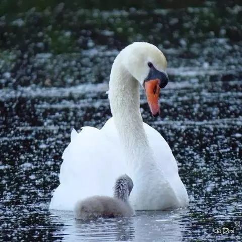刚出壳的幼雏羽毛呈浅灰色,胎绒羽湿润,不能站立,依偎在雌鸟翅下或腹下取暖。2-5小时绒羽干燥松软,即可站立。8小时后雏鸟能从雌鸟翅下伸出头颈观察四周,若有动静,幼雏很快将头缩回。1-3天后可随亲鸟下水活动,在亲鸟带领下觅食。幼雏的食物有植物的嫩叶、果实、昆虫等。首先亲鸟叼起食物唤雏,雏走到跟前时,亲鸟把食物放在地上,雏食之,也有直接从亲鸟嘴中取食。幼雏随亲鸟在水中、岸边觅食,饱食后选择较干燥处休息。此阶段幼雏食量很大,发育极快。孵化后150-170天离窝。幼鸟6个月左右即可飞行,但会留在家庭组约9个月。
