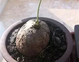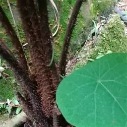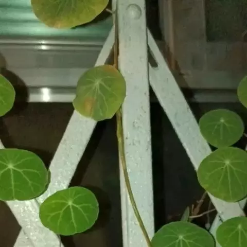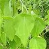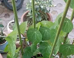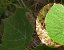 多年生藤本。茎黄褐色,有扭曲纵皱纹。叶互生,叶柄较长,盾状着生;叶片卵圆形或近宽三角形,先端锐尖,基部略凹陷或平截,粉绿色,叶脉掌状,背面带红棕色。伞形花序腋生或生于幼茎基部,花小,黄绿色;单性花,萼片、花瓣均肉质。核果。