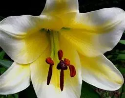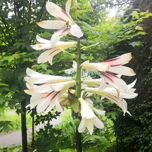大百合植株健壮,7-8月抽莛开花,花大洁白,十 分雅致。其果实椭圆状球形,似一颗颗绿宝石嵌于花茎顶端。 宜栽植于大庭院或稀疏林下半阴处,也可盆栽观赏,点缀居室和阳台。