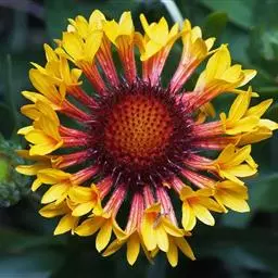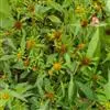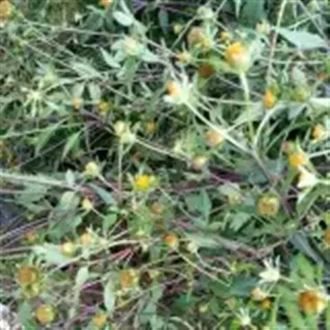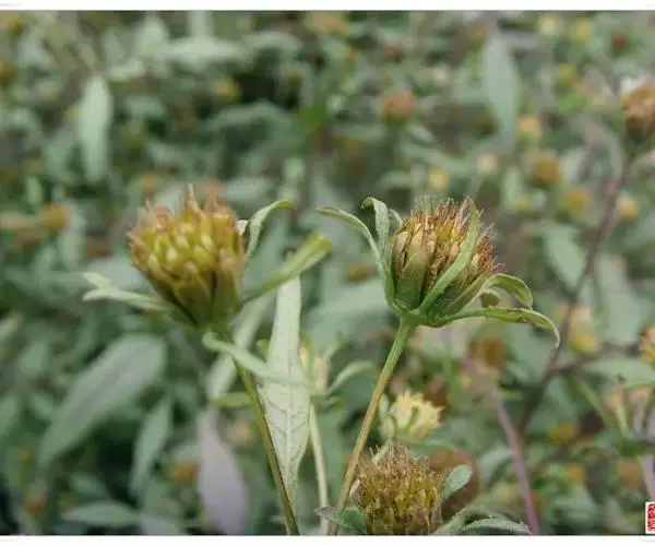 叶对生,无毛,叶柄有狭翅,中部叶通常羽状,3~5裂,顶端裂片较大,椭圆形或长椭圆状披针形,边缘有锯齿;上部叶3深裂或不裂。头状花序顶生或腋生,直径1~3cm;总苞片多数,外层倒披针形,叶状,长1~4cm,有睫毛;花黄色,全为两性管状花。瘦果扁平,倒卵状楔形,边缘有倒刺毛,顶端有芒刺2,少有3~4枚,两侧有倒刺毛。