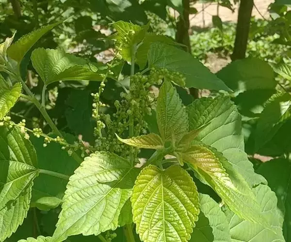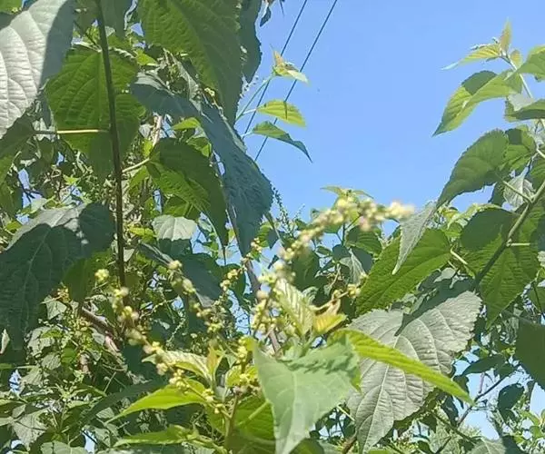灌木或小乔木,高1.5-5米;小枝、叶柄、花序均密被白色或淡黄色长柔毛。叶纸质,卵形或卵状椭圆形,长7-14厘米,宽5-12厘米,顶端渐尖,基部圆形或近截平,稀浅心形或阔楔形,边缘具锯齿,上面被糙伏毛,下面被绒毛,叶脉上被白色长柔毛;基出脉3-5条,侧脉4-6对:近基部两侧常具褐色斑状腺体2-4个;叶柄长3-8厘米,顶端具2枚线形小托叶,长约3毫米,被毛,边缘具黄色小腺体。总状花序或下部多分枝呈圆锥花序,长15-20厘米,苞片卵形,长约2毫米;雄花3-5朵簇生于苞腋,花梗长约3毫米;花萼裂片3-5,卵形,长约2毫米,顶端渐尖;雄蕊35-60枚,花丝纤细;腺体小,棒状圆锥形;雌花1-2朵生于苞腋,苞片披针形,长约2毫米,疏生长柔毛,花梗长约3毫米;花萼裂片卵形,长约3毫米;花盘具圆齿,被毛;子房被黄色糙伏毛,花柱长1-3毫米,外反,2深裂至近基部,密生羽毛状突起。蒴果扁球形,直径6-8毫米,被柔毛。花期4-8月,果期8-10月。