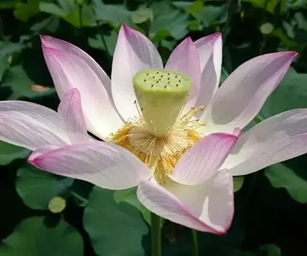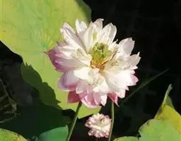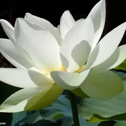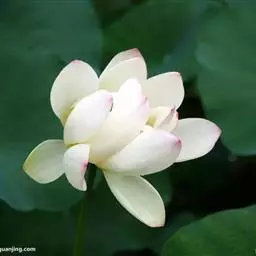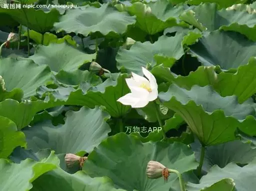 白色莲花 花色丰富,主要有红色、粉红色、白色、绿色、黄色等,花型主要有单瓣,多瓣,重瓣和千瓣。叶片呈深绿色或黄绿色,全缘盾状,表面有蜡质附着,因此水很难吸附其上而呈水珠状。莲的叶片有三种类型,有初生浮于水面的钱叶,有着生在藕带的节间处、浮于水面且叶面积略大的浮叶,有着生与藕带节间处、挺出水面的立叶。莲的叶柄从淤泥中地下茎节间处抽出,表面多有倒刺;莲的根为须状根,围绕着地下茎节间生长。莲的地下茎及叶柄内均有通气的孔道。莲地下茎顶端的顶芽,又称为藕苫,其抽生出新的地下茎节间,被称为藕带。