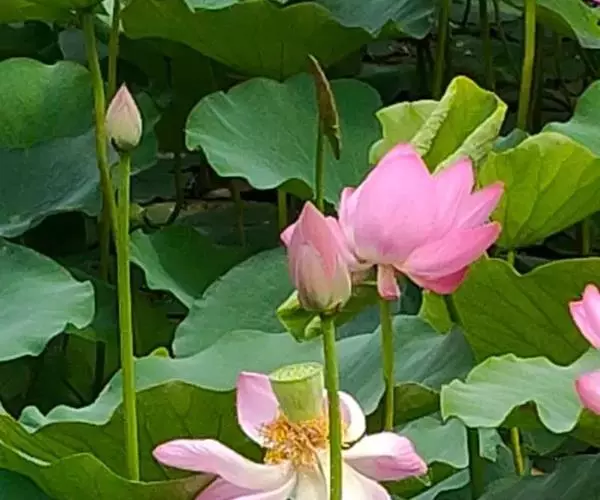 莲喜空气流动的环境。在微风下婆娑多姿;遇6级以上大风,莲叶彼此碰撞易破损,重瓣、重台、千瓣等大花品种的花柄易折断和倒伏,碗莲则更娇,花易伤,蕾易败。