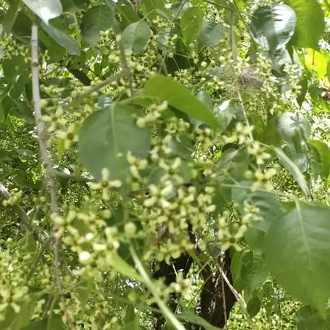 聚伞花序1-3花;花序梗长约1厘米,小花梗长5毫米;花白绿色,直径约8毫米,4数;萼片半圆形;花瓣近圆形;雄蕊着生花盘边缘处,花丝极短,开花后稍增长,花药宽阔长方形,2室顶裂。蒴果1-4深裂,裂瓣椭圆状,长7-8毫米;种子椭圆状或阔椭圆状,长5-6毫米,种皮褐色或浅棕色,假种皮橙红色,全包种子。花期5-6月,果期7-10月。