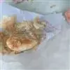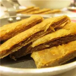 3.取一个剂子,两端封口,擀成薄片儿,放入六成热的油锅中,两面煎黄,待饼鼓起来就熟了