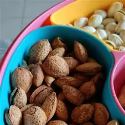 种子椭圆形或长卵圆形,长2~4cm,直径1.5~2.5cm。外表面黄棕色至深棕色,微具纵棱,一端钝圆,具一椭圆形种脐,色稍淡,较平滑,另端略尖。种皮坚而脆,破开后可见种仁1枚,卵圆形,外胚乳膜质,灰褐色,极皱缩,内胚乳肥大,黄白色,质坚实,富油性。气微,味微甜涩。炒熟后具香气。