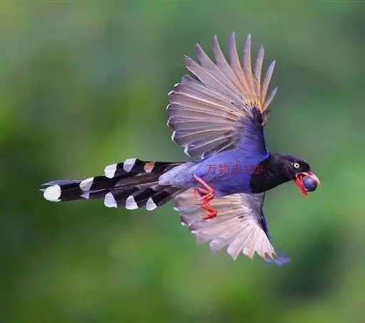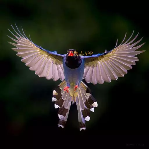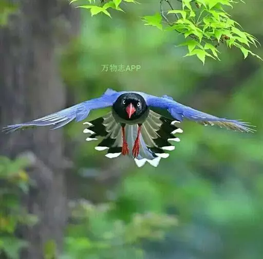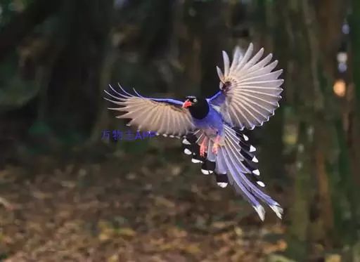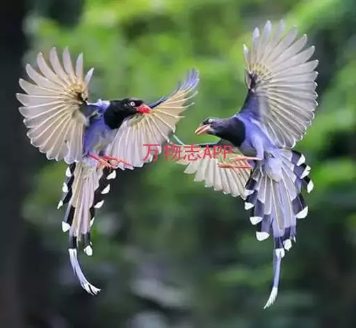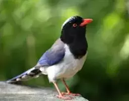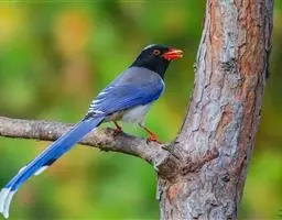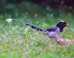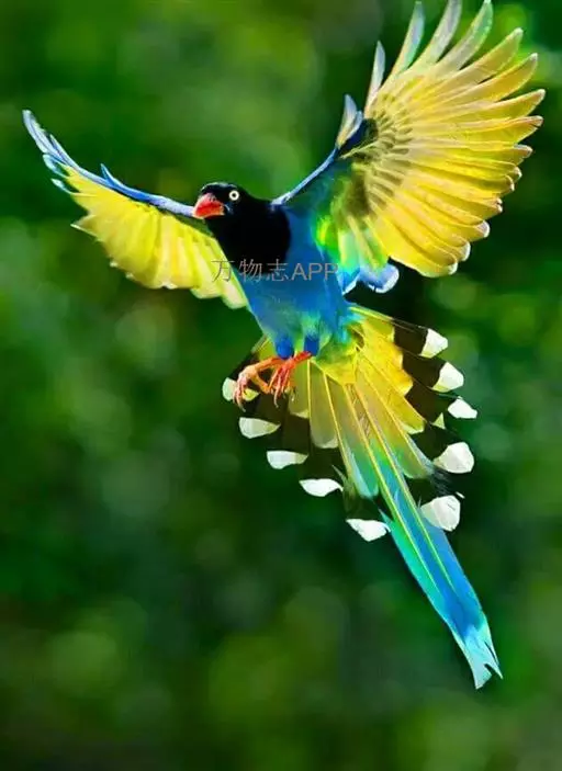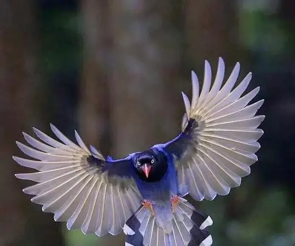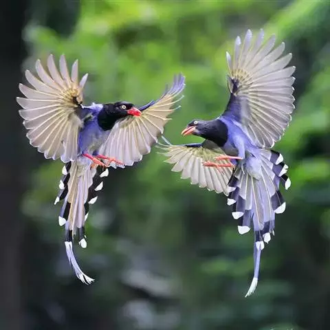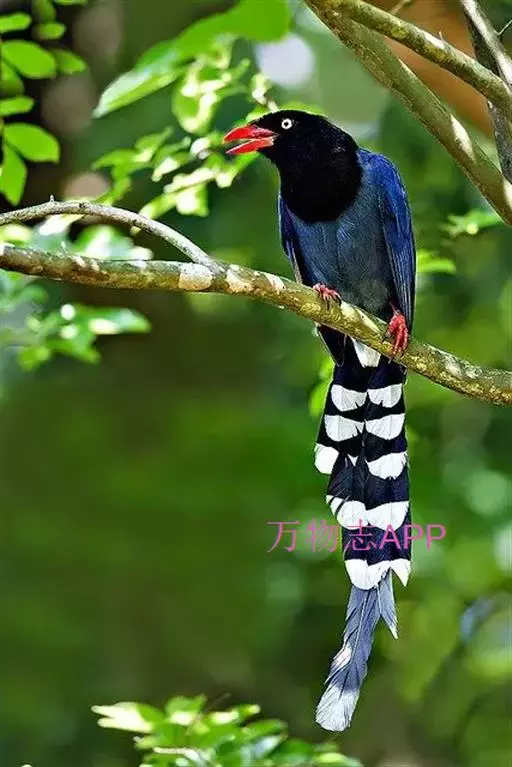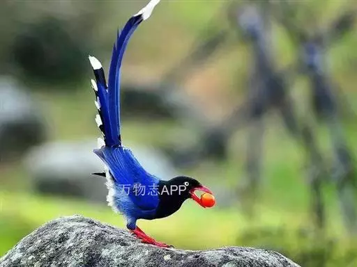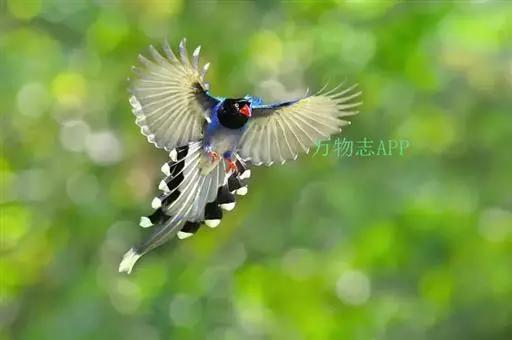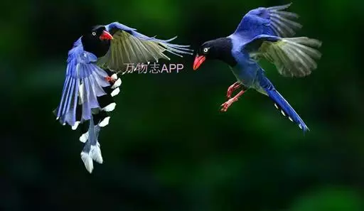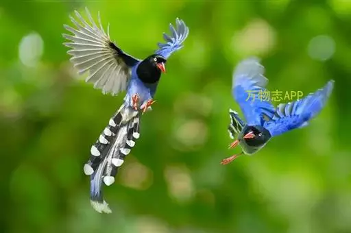 台湾蓝鹊(学名:Urocissa caerulea):体长64至65厘米,翼展18至21厘米,尾长约40厘米,尾羽长占了总体长的三分之二。头、脸、颈、喉、胸都是黑色,黄色的眼珠包围黑色的瞳孔,鲜红色的鸟喙、双脚,身体上半部可目视处及下半部的腹部呈鲜蓝色,有十二根尾羽,最长二羽为蓝根白尾,其于为黑根白尾,左右对称。下腹和尾下覆羽灰白色。