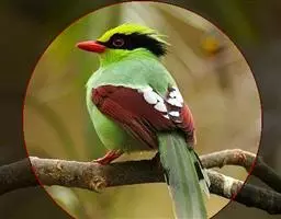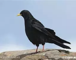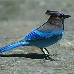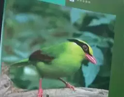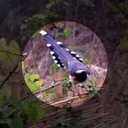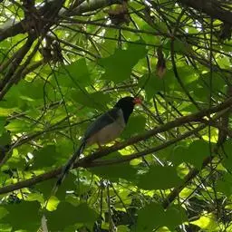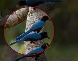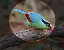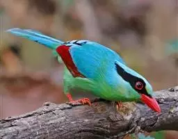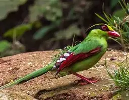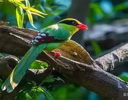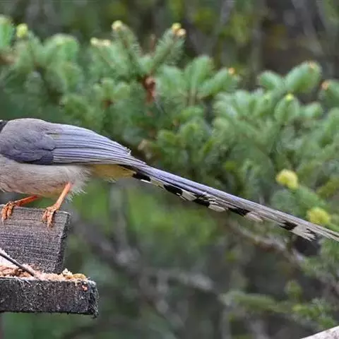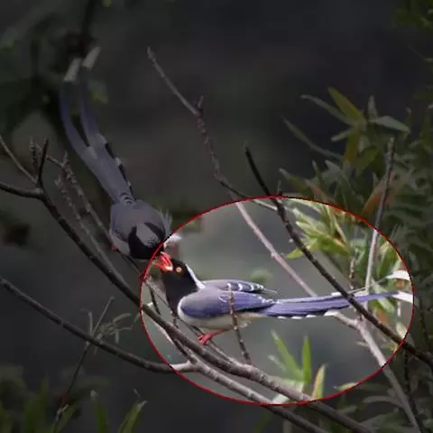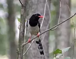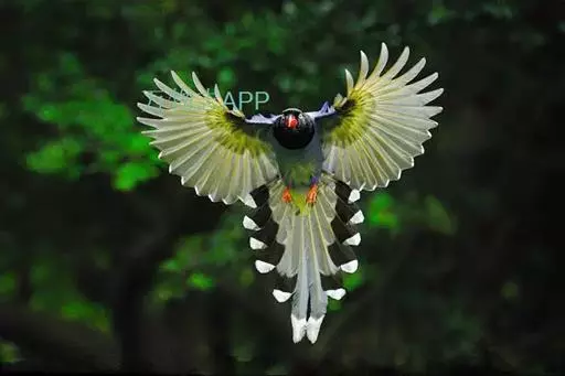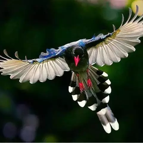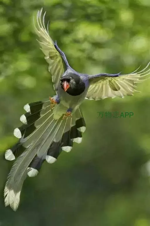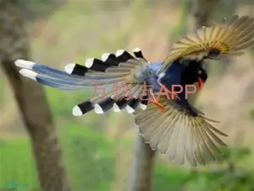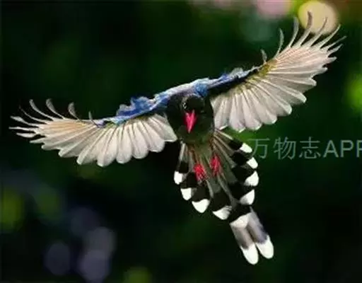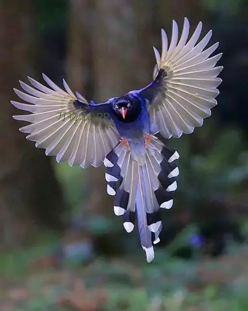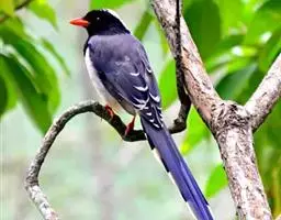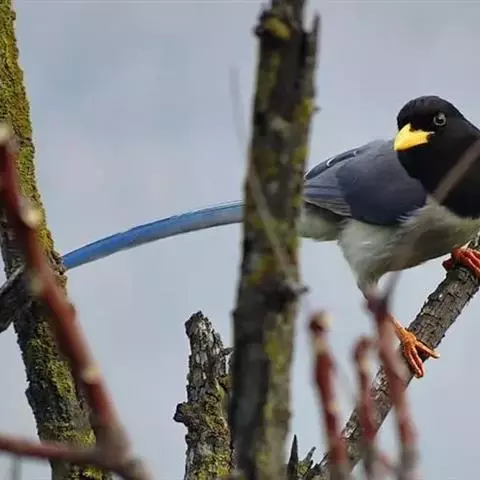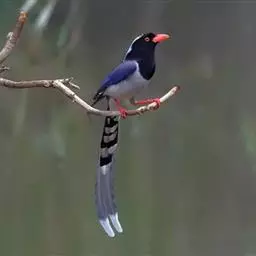 台湾蓝鹊(学名:Urocissa caerulea):体长64至65厘米,翼展18至21厘米,尾长约40厘米,尾羽长占了总体长的三分之二。头、脸、颈、喉、胸都是黑色,黄色的眼珠包围黑色的瞳孔,鲜红色的鸟喙、双脚,身体上半部可目视处及下半部的腹部呈鲜蓝色,有十二根尾羽,最长二羽为蓝根白尾,其于为黑根白尾,左右对称。下腹和尾下覆羽灰白色。