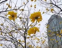 凌霄(学名Campsis grandiflora (Thunb.) Schum.),别名紫葳、五爪龙、红花倒水莲、倒挂金钟、上树龙、上树蜈蚣、白狗肠、吊墙花、堕胎花、芰华、藤罗花。落叶攀援藤本,茎木质,表皮脱落,枯褐色,以气生根攀附于它物之上。叶对生,为奇数羽状复叶顶生疏散的短圆锥花序。花萼钟状,花冠内面鲜红色,外面橙黄色。雄蕊着生于花冠筒近基部,花丝线形,细长。花药黄色,个字形着生。花柱线形,柱头扁平。蒴果顶端钝。花期5-8月。