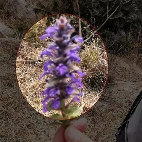 轮伞花序多花,在茎顶密集成径达6厘米的头状花序;苞片叶状,染红色,短于花序,具短柄,全缘,疏被柔毛,下面具凹陷腺点,小苞片线状钻形,长约1厘米,基部宽1.5毫米,先端长尾尖,具肋,被微柔毛,染红色;花梗短,长约1毫米,被微柔毛。花萼管状,稍弯曲,长约1厘米,宽2.5毫米,干时紫红色,具15脉,外面沿肋上被短柔毛,内面在喉部被稀疏硬毛,萼齿5,钻状三角形,长约1毫米,先端具硬刺尖头,等大。花冠紫红色,长约为花萼2.5倍,外面被微柔毛,内面在冠筒被微柔毛,冠檐二唇形,上唇直立,先端稍外弯,全缘,下唇3裂,平展,中裂片较狭长,顶端微缺。能育雄蕊2,靠着上唇微外伸,花丝无毛,花药线形,中部着生。花柱超出雄蕊,无毛,先端为不相等2浅裂。花期7月。