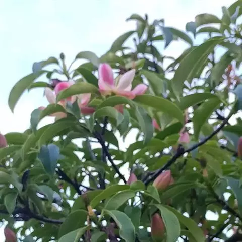 嫩枝绿色,密被长柔毛,后渐脱落,仅节上残留有毛,老枝灰黄色。叶革质,倒披针形或倒卵形,长11-20厘米,宽3-6厘米,先端渐尖或短尾状尖,1/3以下渐狭至基部,楔形,上面深绿色,有光泽,无毛,下面淡绿色,被淡褐色短毛;中脉被白色长毛,侧脉每边13-16条,网脉稀疏,干时两面均凸起;叶柄长15-25毫米,被白色长毛,托叶痕长4-6 毫米。花大,单生枝端,有芳香。花蕾卵圆形,距花被下3-6毫米处具1苞片脱落痕;花被片9,紫红色外轮3片倒卵形,长5.5-6.5厘米,宽3厘米,浅绿而常紫色,被稀疏长柔毛,中内两轮紫红色,长4-5.5厘米,宽2.5-3厘米,内轮的较小;雄蕊长12-20毫米,花药长约10毫米,内向,药隔伸出成1毫米的三角短尖头;花丝深红色,长1毫米;雌蕊群卵状椭圆体形,长2-2.5厘米,心皮狭椭圆体形,长8-10毫米,浅绿色,密被褐色短绒毛;花柱淡红色,长约3毫米。聚合果卵球形,黄褐色,蓇葖缘状,革质,长8-10厘米。花期4-5月,果期8-9月。香花类,夏季观花。 [1-2]