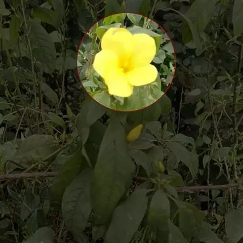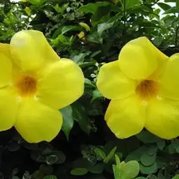 黄蝉属,夹竹桃科,约15种,分布于热带美洲,中国引入栽培的有黄蝉A. neriifolia Hook. 和软枝黄蝉 A. cathartica L. 2种,广州极常见,供观赏。直立或藤状灌木;叶生或轮生;花大而美丽,黄色,数朵排成总状花序,萼5深裂,基部里面无腺体;花冠钟状或漏斗状,喉部有被毛的鳞片;花药与花柱分离;花盘环状,全缘或5裂;子房1室,具两个侧膜胎座,有胚珠多颗;果为一有刺的蒴果,开裂为2果瓣;种子有翅。