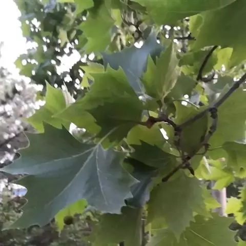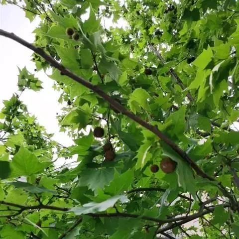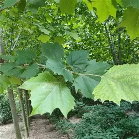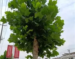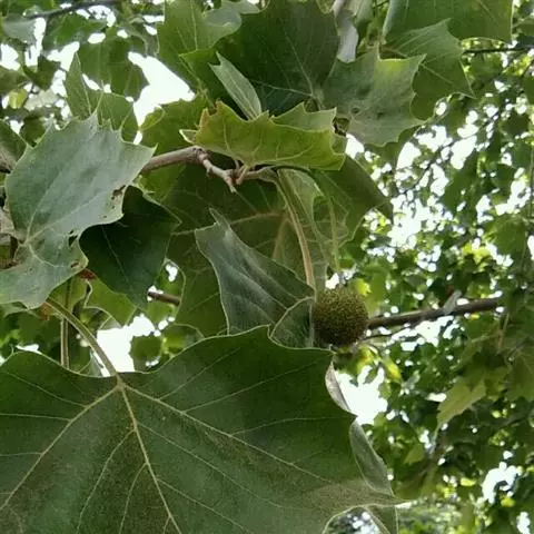 落叶大乔木,高可达35米。枝条开展,树冠广阔,呈长椭圆形。树皮灰绿或灰白色,不规则片状剥落,剥落后呈粉绿色,光滑。柄下芽。单叶互生,叶大,叶片三角状,长9~15厘米,宽9~17厘米,3~5掌状分裂,边缘有不规则尖齿和波状齿,基部截形或近心脏形,嫩时有星状毛,后近于无毛。花期4~5月,头状花序球形,球形花序直径2.5~3.5厘米;花长约4毫米;萼片4;花瓣4;雄花(4~8个雄蕊);雌花(有6个分离心皮)。球果下垂,通常2球一串。9~10月果熟,坚果基部有长毛。