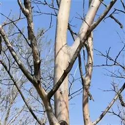 悬铃木是我国很多地区街道绿化、厂区绿化的常用树种,但绿化中参差不齐的现象普遍存在,其主要原因在于植栽时选择苗木不整齐,只求植裁成活率,忽视中后期管理(整形修剪等),使悬铃木树姿的特点未能充分体现。下面谈谈悬铃木的整形修剪: 一、在圃整形修剪 在圃整形修剪必须在苗木合理密植的基础上进行。培育杯状行道树大苗时,扦插的株行距为60×60厘米。选择速生少球悬铃木品种,当年株高可达到2.5至3.5米,待秋后或初春按“隔行去行,隔株去株,留大去小,保强去弱”的原则定苗,使留苗株行距巨基本达到1.2×1.2米。苗木第二年继续生长,冬季定干,在对高3.5至4.0处去梢,将分枝点以下主干上的侧枝剪去。第三年待苗木萌芽后,选留3至5个分支点附近分布均匀、与主干成45°左右夹角、生长粗壮的枝条作为主枝,其余分批剪去。冬季主枝留50至80厘米短截,剪口芽留在侧面,尽量使其处于同一水平面上,翌春萌发后各选留2个3级侧枝斜向生长,形成“3股6杈12枝”的造型,经以上3至4年培育的大苗胸径在7至8厘米以上,已初具杯状冠型,符合行道树标准,可出圃。 二、植栽后整形修剪 林状行道树栽植后,4至5年内应继续修剪,方法与苗期相同,直至树冠具备4至5级侧枝时为止。以后每年休眠期对当年生枝条短截,保留15至20厘米,称小回头,使萌条位置逐年提高,当枝条顶端将触及线路时,应回缩降低高度,称大回头。大小回头交替进行,使树冠维持在一定高度。 三、其他情况整形修剪 如果苗木出圃定植时未形成杯状树冠,栽植后再造型,可将定植后的苗木按理想高度定干,等萌发后留3支分布均匀、生长粗壮的枝条作为主枝,冬季短截,以后也按上述修剪方法进行。 如果道路不是很宽,上方又无电线通过,可采用开心型树冠。在栽植定干后,选留4至6根主枝,每年冬季短截后,选留1个略向斜上方生长的枝条作为主枝延长枝,使树冠逐年上升,即可形成椭圆形内膛中空的冠形。修剪时应强枝弱剪,弱枝强剪,使树冠均衡发展。另外,悬铃木除作为行道树栽植外,还可作为庭荫树、孤植树。作为庭荫树、孤植树栽植时、以自然冠形为宜。