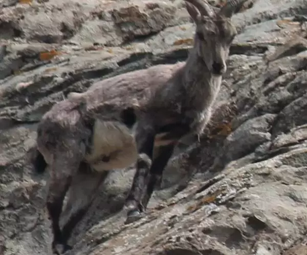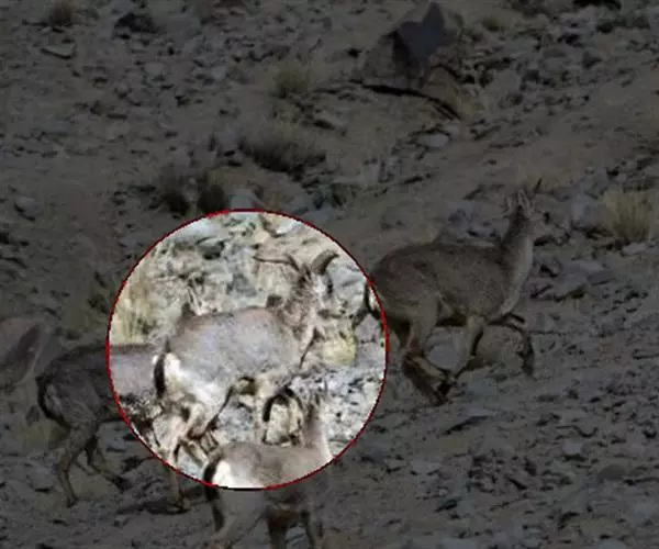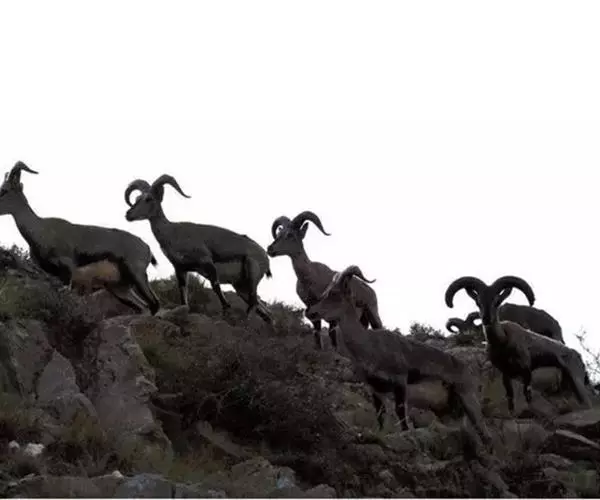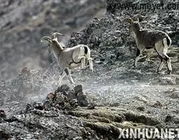 2014年12月12日,岩羊在山壁上活动。进入冬季,宁夏贺兰山标志性生物、国家二级保护动物岩羊开始有规律地在山脚下活动,寻找水源和食物。近年来,由于封山禁牧、退耕还林等政策,宁夏贺兰山一带生态系统逐步恢复,岩羊数量稳中有升,目前分布达到每平方公里14到17只,总量也由封山禁牧前的1万余只增加到现在的2万只以上。