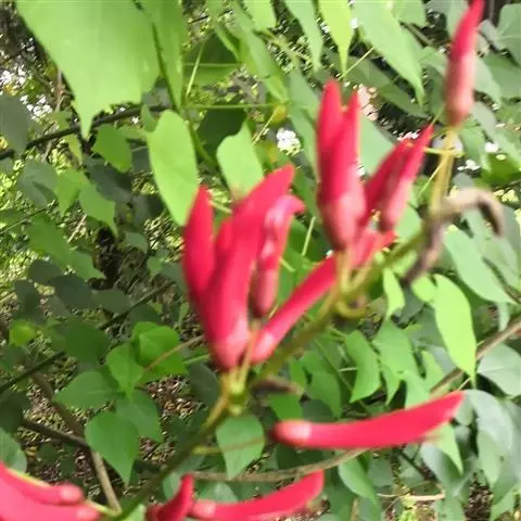 总状花序顶生,长10-16厘米,上有密集、成对着生的花;总花梗木质,粗壮,长7-10厘米,花梗长约1厘米,具短绒毛;花萼佛焰苞状,长2-3厘米,口部偏斜,一边开裂;花冠红色,长6-7毫米,旗瓣椭圆形,长5-6厘米,宽约2.5厘米,先端圆,瓣柄短;翼瓣与龙骨瓣近等长;龙骨瓣2片离生,雄蕊10,单体;子房被微柔毛;花柱无毛。