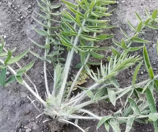 多年生草本,高5-20厘米,外倾,植株各部密被开展白色绢状长柔毛,淡灰色。主根发达,直伸,暗褐色。茎缩短,簇生。轮生羽状复叶长4-20厘米;托叶膜质,卵状披针形,与叶柄贴生很高,彼此于基部合生,先端分离而渐尖,密被白色绢状长柔毛;叶轴有时微具腺体;小叶7-17轮(对),对生或4片轮生,线形、线状披针形、披针形,长3-23毫米,宽1.5-6.5毫米,先端急尖,基部圆形,边缘常反卷,两面密被绢状长柔毛,上面毛较疏。