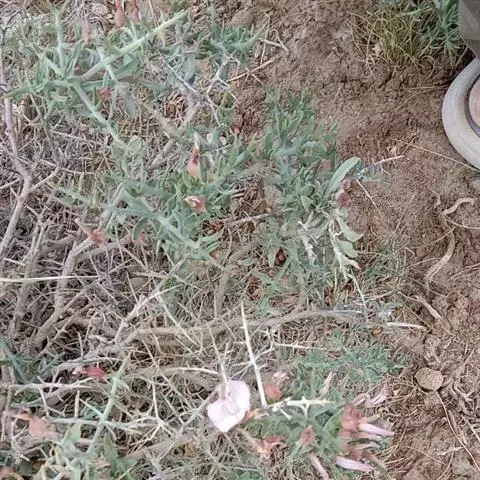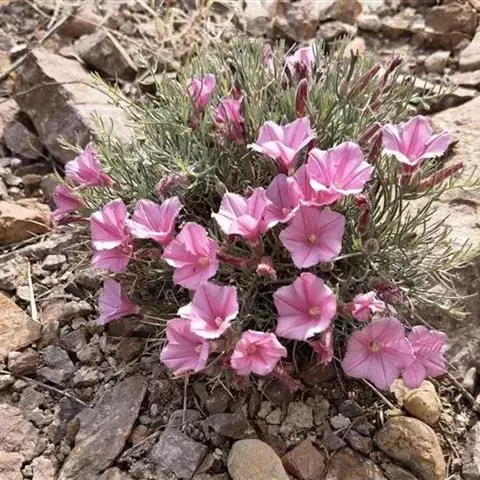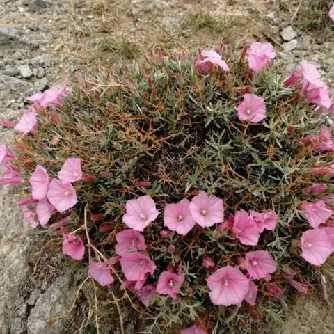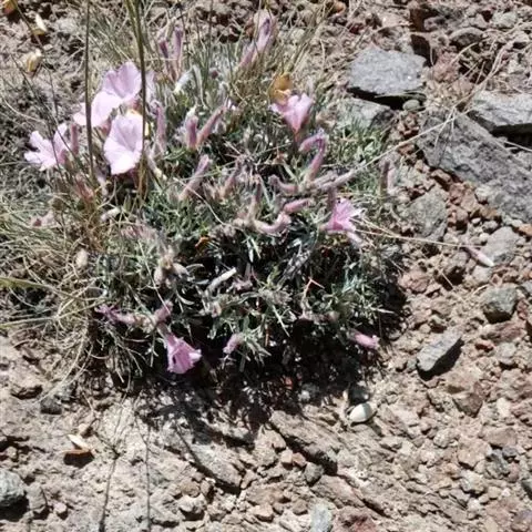 多年生草本,根状茎短,木质化,茎少数或多数,高2~10(~15)厘米,平卧或上升,枝和叶密被贴生稀半贴生银灰色绢毛。叶互生,线形或狭披针形,长1~2厘米,宽(0.5~)1~4(5)毫米,先端锐尖,基部狭,无柄。花单生枝端,具细花梗,长0.5~7厘米;萼片5,长(3-5~)4~7毫米,外萼片长圆形或长圆状椭圆形,近锐尖或稍渐尖,内萼片较宽,椭圆形,渐尖,密被贴生银色毛;花冠小,漏斗状,长(8)~9~15毫米,淡玫瑰色或白色带紫色条纹,有毛,5浅裂;雄蕊5,较花冠短一半,基部稍扩大;雌蕊无毛,较雄蕊稍长,子房2室,每室2胚珠;花柱2裂,柱头2,线形。蒴果球形,2裂,长约4~5毫米。种子2~3枚,卵圆形,光滑,具喙,淡褐红色。