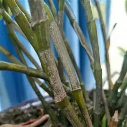 根状茎稍粗壮,粗5—6毫米,密被褐色鞘。假鳞茎在根状茎上较密集,相距6—7毫米,近长圆形,向两端稍变狭,长2—3厘米,粗5—7毫米,干后无光泽,顶端生2枚叶,基部具鞘;鞘褐色,长1.5—2厘米。