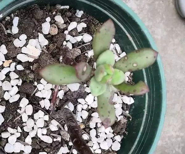 小天狗叶片半橄榄型,叶片颜色绿,叶片上密布小斑点,叶缘至叶片的顶端微褐红色,在晚秋和早春,温差大的时候红褐色尤为明显。开花为白色,每年的9月至第二年的6月为植株的生长期(环境不一样,生长期也有长短),若光照不足会使植株徒长,叶与叶之间的上下距离拉长,使得株型松散,茎变的很脆弱,叶缘的红褐色也会减退变绿;而在阳光充足之处生长的植株,株型矮壮,茎节之间排列会紧凑。