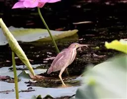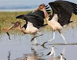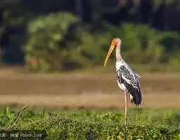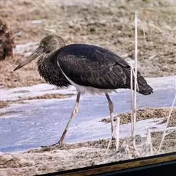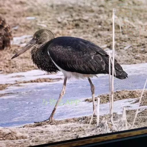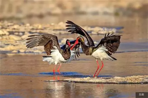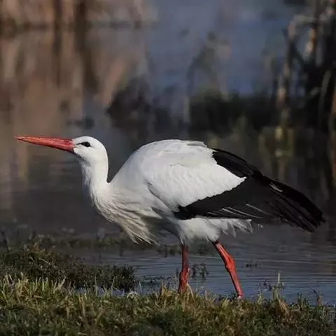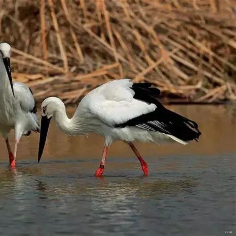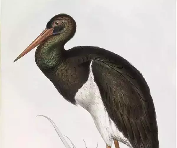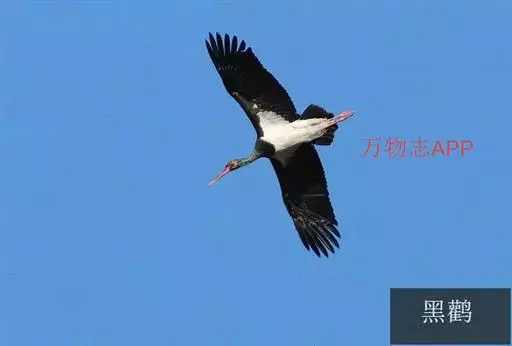 黑鹳,又叫“乌鹳”、“锅鹳”。它体长约1米,上体羽毛为黑色,并带有紫绿色的金属光泽,胸下部及腹部羽毛为白色,嘴、腿均为红色。黑鹳在我国分布较广,种群数量要比白鹳多。夏季在北方各省都可见到黑鹳,冬天它们则去南方越冬。黑鹳喜欢结群,常常在沼泽和湿地间觅食,以鱼、蛙、甲壳动物等为主要食物,年产卵2-6个,呈白色。在东北、华北一带的黑鹳,常筑巢于山区的岩隙悬崖间,而新疆的黑鹳则在塔里木河流域的胡杨树上营巢。