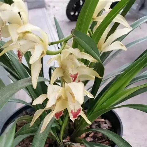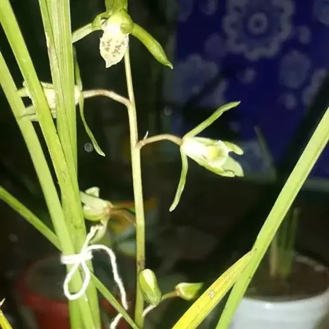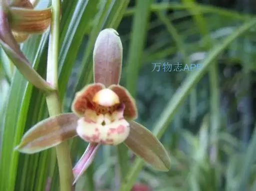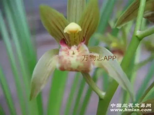花葶从假鳞茎基部发出,直立,长20-40厘米;总状花序具3-7朵花;花苞片近披针形,长1.4-4.1厘米,在花序上部的亦超过花梗和子房长度的1/2;花梗和子房长1.5-2.5厘米;花与寒兰颇相似,有柠檬香气;萼片与花瓣黄绿色或苹果绿色,偶见淡黄色或草黄色,唇瓣色淡或有时带白色或淡黄色,侧裂片上有紫纹,中裂片上有紫色斑;萼片线形至宽线形,长1.8-3.5厘米,宽4-7毫米。