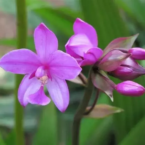 紫花苞舌兰:植株高达1米。假鳞茎卵状圆锥形,具3-5枚叶。叶质地薄,淡绿色,狭长,具折扇状的脉。…