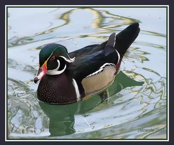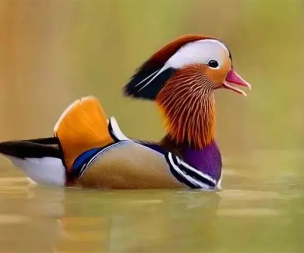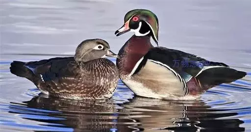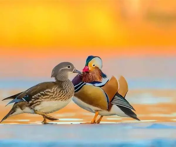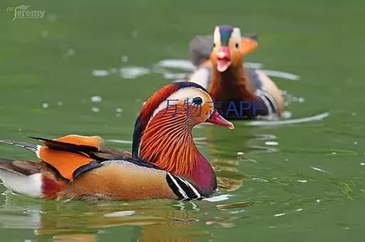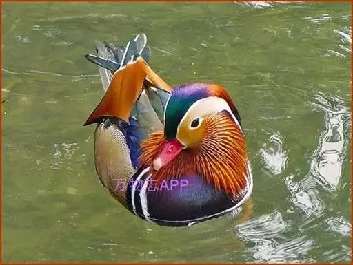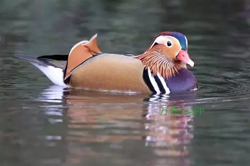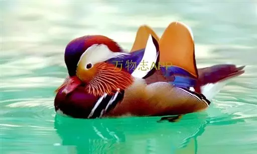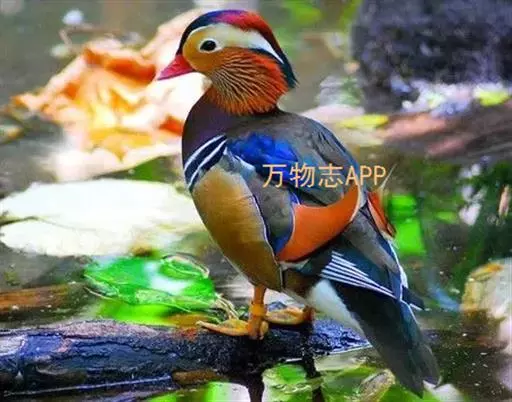 鸳鸯(学名:Aix galericulata):鸳指雄鸟,鸯指雌鸟,故鸳鸯属合成词。属雁形目的中型鸭类,大小介于绿头鸭和绿翅鸭之间,体长38-45厘米,体重0.5千克左右。雌雄异色,雄鸟嘴红色,脚橙黄色,羽色鲜艳而华丽,头具艳丽的冠羽,眼后有宽阔的白色眉纹,翅上有一对栗黄色扇状直立羽,像帆一样立于后背,非常奇特和醒目,野外极易辨认。雌鸟嘴黑色,脚橙黄色,头和整个上体灰褐色,眼周白色,其后连一细的白色眉纹,亦极为醒目和独特。