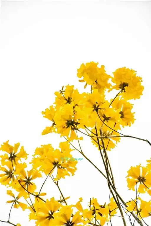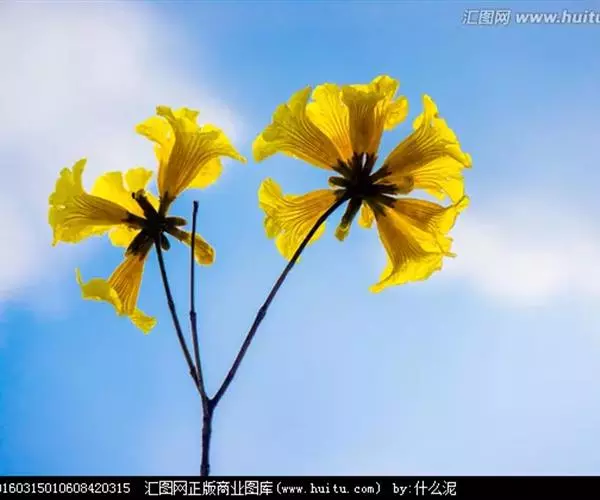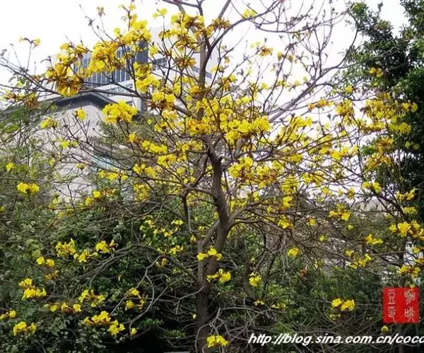 黄钟木别名黄花风铃木,树高约5米;掌状复叶,小叶3-5枚,叶片被褐色细茸毛;花集生于枝端,花冠漏斗形,鲜黄色;果实圆柱形,下垂,被褐色茸毛,形如可爱的小猫尾巴。先花后叶,春季绽放风铃般的花朵挂满枝头,花团锦簇,形成一片金黄色的花海,极为壮观,可做行道树、庭院树。