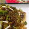2。莴笋丝上放上肉丝、葱丝、姜丝,浇上炸好的花椒油,略焖一会儿,再加精盐、味精,拌匀即成。