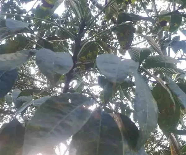 症状:古铜色嫩叶感病后,呈现不规则形,暗绿色像开水烫过一样的水渍状病斑,即所谓急性型病斑,病斑大而凹陷。淡绿色嫩叶感病后呈现出近圆形或不规则形的暗绿色或褐色病斑,病斑边缘凹凸不平,叶片皱缩畸形;随着叶片老化,病斑边缘变褐,中央呈灰褐色,并会穿孔。接近老化的叶片感病后,病斑凸起成小圆锥体。嫩梢、叶柄、叶脉感病后,出现黑色下陷小点或黑色条斑。芽接苗感病后,嫩茎一旦被病斑环绕,顶芽便会发生回枯。绿果感病后,病斑暗绿色,水渍状腐烂。