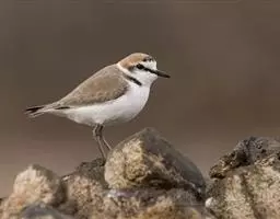 雄鸟繁殖羽前额棕色,头顶亦为棕色而杂有黑褐色斑纹;头侧及头上部浅白色,满杂以褐色斑点;自嘴基经眼到耳区有一条暗褐色贯眼纹。后颈上部、背暗褐色;上背和两肩具波状白色细斑,较长的肩羽边缘棕色,下背纯暗褐色,具浅色羽缘。腰、尾侧、尾上和尾下覆羽绒黑色,尾羽灰褐色而具白色羽缘。两翅小覆羽和初级覆羽淡褐色,中覆羽棕栗色,外侧大覆羽亦为棕栗色,向内转为绒黑色;初级飞羽暗褐色,次级飞羽灰褐色,外侧数枚外翈绒黑色,内侧数枚外翈白色,形成黑白二色翼镜,三级飞羽淡灰褐色,边缘和羽端较淡。颏棕色,喉及前颈上部棕白色,密杂以褐色斑;颈部领圈棕红色,在后颈中部断开。前颈下部及胸暗褐色,密杂以星月形白斑,使羽呈鳞片状;腹白色,下腹微具褐色细斑。两胁与上背略同,但褐色较浅。腋羽纯白色。雄鸟非繁殖羽似雌鸟。