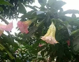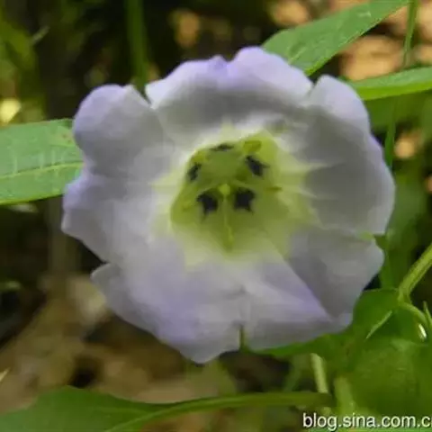 花俯垂,花梗长2-3厘米,密生白色腺毛;花萼长约为花冠之半,裂片三角形,长1-1.5厘米,顶端渐尖,生腺毛,花后稍增大,果实成星芒状向外开展;花冠筒状钟形,下部黄绿色,上部淡紫色,长2.5-3厘米,直径约1.5厘米,筒中部稍膨大,5浅裂,裂片顶端钝,花开放时向外反拆,外面纵脉隆起,被腺毛,内面筒基部有毛;花丝下端生柔毛,上端向下弓曲,长约1.7厘米,花药椭圆形,黄色;花盘绕生于子房基部;花柱长约2厘米,柱头带绿色。