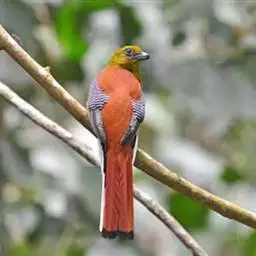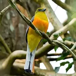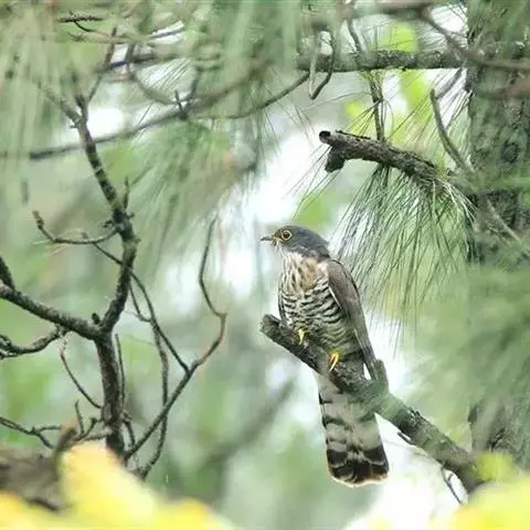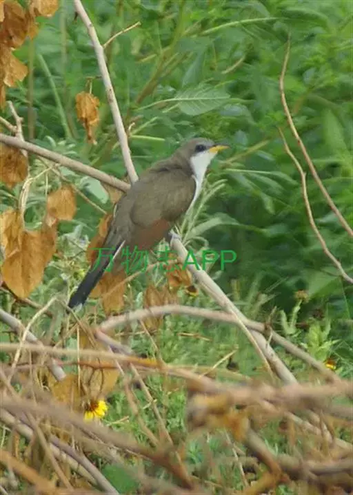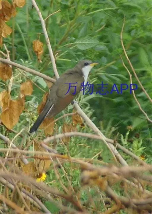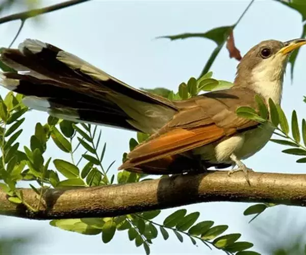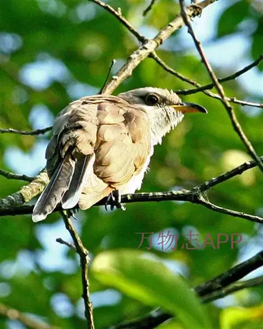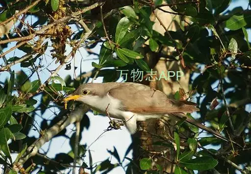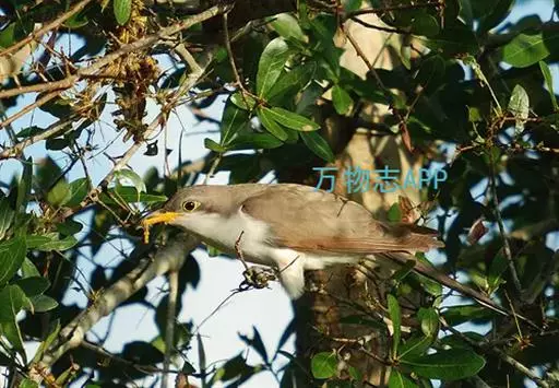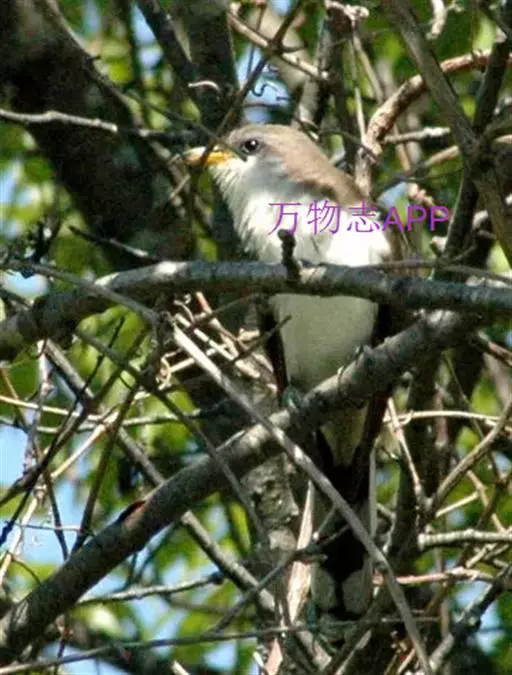 黄嘴杜鹃(Coccyzus americanus):成鸟体长26-30厘米,体重55-56克。有一条长长的尾巴,上面是棕色,下面是黑色和白色相间,下颌至鸟喙有带黄色的一个黑色弧形。主要以昆虫为食,尤其喜吃鳞翅目幼虫,如松毛虫,树粉蝶幼虫、蛾类等,有时也吃植物种子等少量植物性食物。