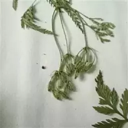 基生叶薄膜质,长圆形,二至三回羽状全裂,末回裂片线形或披针形,长2-15毫米,宽0.5-4毫米,顶端尖锐,有小尖头,光滑或有糙硬毛;叶柄长3-12厘米;茎生叶近无柄,有叶鞘,末回裂片小或细长。