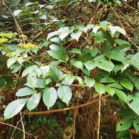 花序为疏散的伞房状复二歧聚伞花序,通常与叶对生或假顶生;花序梗长1.5-4厘米,无毛或被疏柔毛,花梗长1.5-2.5毫米,几无毛;花蕾卵圆形,高2-3毫米,顶端圆形;萼碟形,波状浅裂或几全缘,无毛;花瓣5,卵圆形,高1.7-2.7毫米,无毛;雄蕊5,花药卵圆形,长宽近相等;花盘发达,边缘呈波状;子房下部与花盘合生,花柱钻形,柱头扩大不明显。果实近球形,直径0.6-0.8厘米,有种子2-3颗,种子倒卵圆形,顶端圆形,基部有短喙,种脐在种子背面中部近圆形,种脊向上渐狭呈带状,腹部中梭脊微突出,两则洼穴呈沟状,从基部向上斜展达种子上部1/3。花期5-6月,果期8-9月。