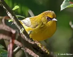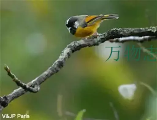 金胸雀鹛(学名:Lioparus chrysotis)是莺科、雀鹛属小型鸟类,体长10-11厘米。头黑色,头顶中央有一道白色中央冠纹,颊和耳羽亦为白色,在黑色的头部极为醒目。上体深灰沾绿。两翅黑色,外侧飞羽有黄色外缘和白色端斑;尾凸状、黑色。颏、喉黑色,胸和其余下体金黄色。虹膜褐色或灰白色、嘴灰蓝色或铅褐色,脚肉色。