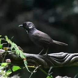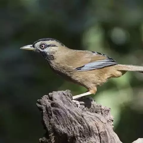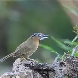 黑顶噪鹛:中型鸟类,体长24-26厘米。前额、脸、颏、喉黑色,头顶黑褐沾棕或深棕橄榄褐色,…