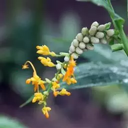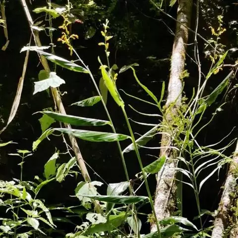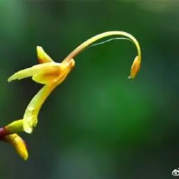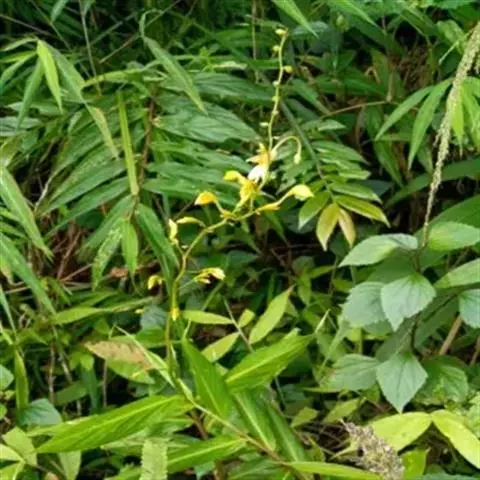 株高30-50厘米。叶片5-6枚,椭圆状披针形,长15-20厘米,宽3-4.5厘米,无毛,顶端尾状渐尖,基部钝;叶柄长约5毫米;叶舌短。圆锥花序长5-11厘米,下垂,上部有分枝,分枝长1-2.5厘米,疏离,有2-多花,下部无分枝,而在苞片内仅有珠芽;苞片披针形,长6-12毫米;珠芽卵形,表面疣状,直径2-4毫米。花黄色,小花梗极短;萼钟状,长4-5毫米,具3齿;花冠管长8-10毫米,被短柔毛,裂片卵形;侧生退化雄蕊披针形,镰状弯曲;唇瓣狭楔形,黄色,顶端2裂,基部具橙红色的斑点;花丝长1厘米,弯曲,花药每边有2个三角形、翅状附属体;子房具疣点。花期:8-9月。