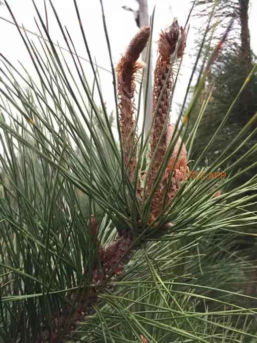 针叶2针一束,深绿色,粗硬,长10-15厘米,径约1.5毫米,边缘有细锯齿,两面具气孔线;横切面半圆形,二型层皮下层,在第一层细胞下常有少数细胞形成第二层皮下层,树脂道5-8个或更多,边生,多数生于背面,腹面有1-2个,稀角部有1-2个中生树脂道,叶鞘初呈淡褐色,后呈淡黑褐色。