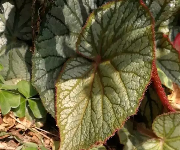 二年生草本,通常被粉,少数植株无粉。叶多数簇生,叶片卵形至椭圆形或矩圆形,长3-10厘米,宽2 8厘米,先端圆形,基部心形或截形,边缘具圆齿状浅裂,裂片6-8对,具不整齐的小牙齿,干时膜质,上面疏被柔毛或近于无毛,下面沿中肋和侧脉被毛或近于无毛,无粉或有时被白粉,中肋及4-6对侧脉在下面明显;叶柄长2-15厘米,鲜时带肉质,具狭翅,被多细胞柔毛。