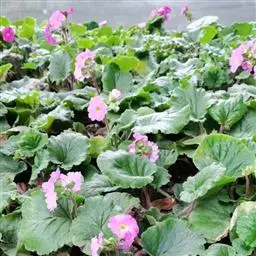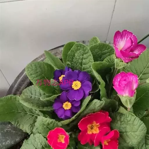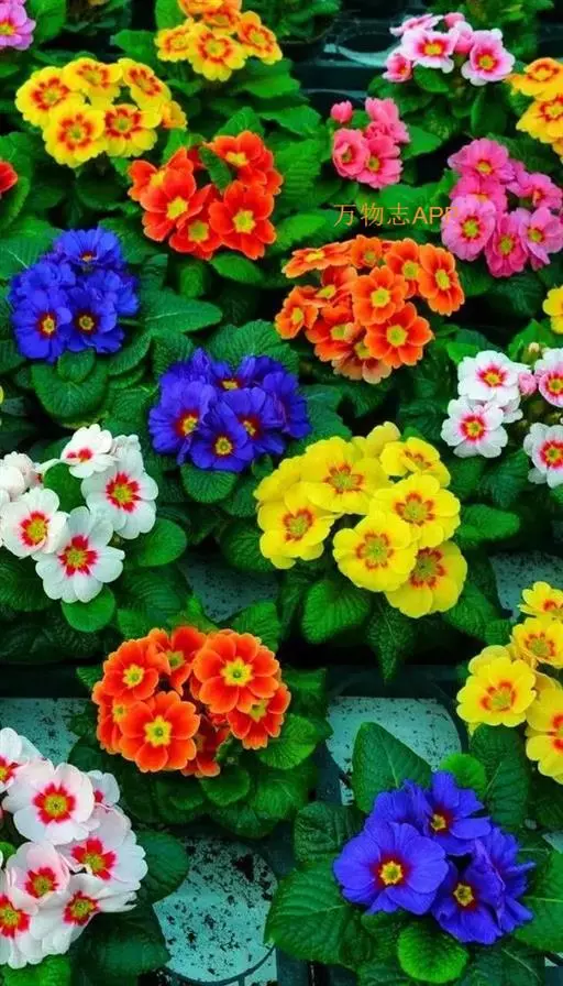 报春花 (Primula malacoides Franch.):报春花科报春花属二年生草本植物,通常被粉,叶簇生,叶片卵形至椭圆形或矩圆形,裂片具不整齐的小牙齿,叶柄被多细胞柔毛。花葶高可达40厘米,伞形花序,苞片线形或线状披针形,花梗纤细,花萼钟状,花冠粉红色,淡蓝紫色或近白色,蒴果球形,2-5月开花,3-6月结果。