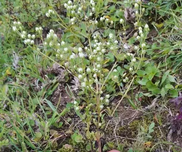 一年生草本,高30-100厘米。根黄褐色,粗壮。茎直立,四棱形,常带紫色,从中部以上分枝,下部直径1.5-5毫米。基生叶及茎下部叶在花期常枯萎,具长柄,叶片匙形,连柄长2-6.5厘米,宽达1.5厘米,先端钝,全缘或边缘有不整齐的小齿,基部渐狭;茎中部叶无柄,叶片矩圆形或披针形,稀倒卵形,长0.4-4.5厘米,宽0.3-1.5厘米,愈向茎上部叶愈小,先端急尖,基部钝,具3-5脉。圆锥状复聚伞花序多花,开展;花梗细弱,长4-15毫米;花5数,稀4数,小,直径4-8毫米;花萼绿色,长为花冠的1/2,裂片卵状椭圆形,长2.5-4毫米,先端钝,背面具1脉;花冠白色或淡蓝色,裂片椭圆形,长4-8毫米,先端钝,基部具2个腺窝,腺窝囊状,矩圆形,边缘仅具数根柔毛状流苏;花丝线形,长4-5毫米,花药椭圆形,长约1.5毫米;子房无柄,卵状披针形,花柱短而明显,柱头头状。蒴果卵形,长5-6毫米;种子3-4个,较大,矩圆形,长1.5-2毫米,褐色,表面光滑。花果期7-11月。