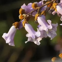 花序枝的侧枝不发达,长约中央主枝之半或稍短,故花序为金字塔形或狭圆锥形,长一般在50厘米以下,少有更长,小聚伞花序的总花梗长1-2厘米,几与花梗等长,具花3-5朵;萼浅钟形,长约1.5厘米,外面绒毛不脱落,分裂至中部或裂过中部,萼齿卵状长圆形,在花中锐头或稍钝头至果中钝头;花冠紫色,漏斗状钟形,长5-7.5厘米,在离管基部约5毫米处弓曲,向上突然膨大,外面有腺毛,内面几无毛,檐部2唇形,直径约小5厘米;雄蕊长达2.5厘米;子房卵圆形,有腺毛,花柱短于雄蕊。蒴果卵圆形,幼时密生粘质腺毛,长3-4.5厘米,宿萼不反卷,果皮厚约1毫米;种子连翅长约2.5-4毫米。花期4-5月,果期8-9月。